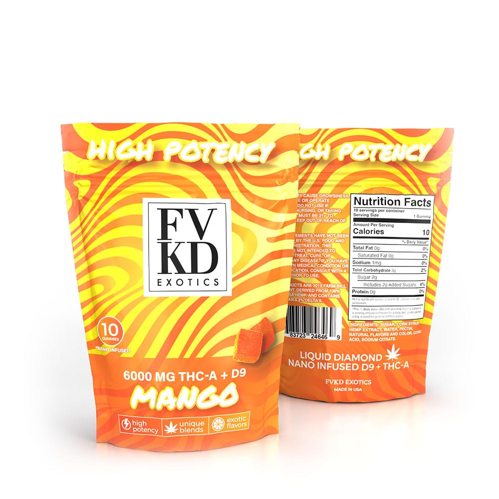 FVKD Mango Gummies 6000 MG pack a punch with THC-A and Delta-9. Enjoy tropical sweetness and smooth euphoria, available in 1pk and 10pk. Buy online.